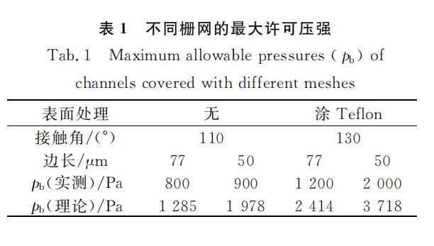 所用柵網為不銹鋼濾網,有一定剛度,管道較窄,可以保證管道頂面平整。柵網孔為方形,使用的兩種柵網孔邊長分別為50mu m和77mu m。部分柵網涂覆Teflon(AF2400,DuPont),部分沒有做處理。圖5所示為未經處理的柵網和柵網上的水滴。