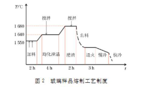 實(shí)驗(yàn)樣品的熔制流程如圖2所示,首先根據(jù)組分設(shè)計(jì)計(jì)算玻璃配方,稱(chēng)量并配制約500g配合料,在研缽內(nèi)充分研磨、混合均勻,待硅鉬棒電爐升溫至1550 ℃時(shí),將混合均勻的配合料分多次加入預(yù)熱過(guò)的鉑金坩堝中,保溫2h至原料熔化充分后以5 ℃/min的升溫速率加熱至1640 ℃,并在該溫度條件下保溫4h,實(shí)現(xiàn)玻璃的充分熔化與澄清。然后繼續(xù)升溫至1680 ℃保溫2h使玻璃液完全澄清,出料前30 min進(jìn)行攪拌,然后將玻璃液澆筑在預(yù)熱的耐熱鋼模內(nèi),成型后轉(zhuǎn)入780 ℃的馬弗爐內(nèi)進(jìn)行退火處理,保溫3h后再以1 ℃/min降溫速率慢冷至300 ℃,隨爐冷卻得到經(jīng)過(guò)退火的玻璃樣塊。