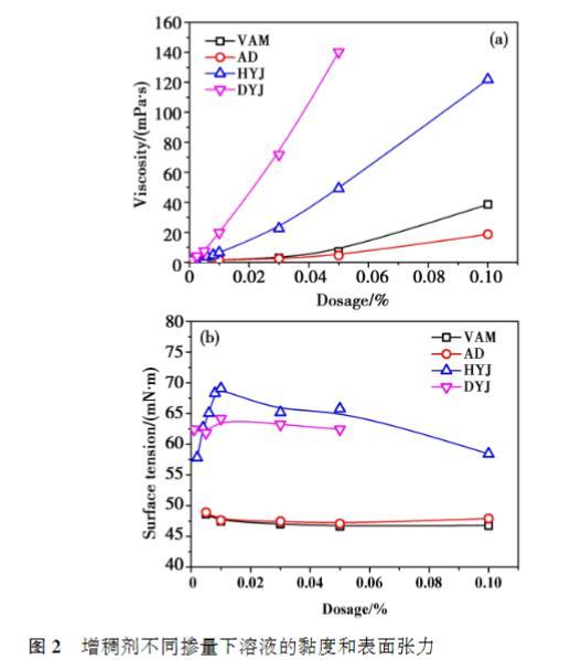 相同摻量下,DYJ的黏度最高,其次是HYJ,VAM和AD黏度在低摻量下接近,摻量達到0.10%之后,VAM黏度高于AD;VAM和AD的黏度隨著摻量的提高緩慢增大,而HYJ和DYJ溶液的黏度隨摻量的提高迅速提高,尤其是DYJ的增長幅度更為顯著。總體來看,增稠劑分子量越大,相同摻量時溶液的黏度越高。從表面張力的結果來看,相同摻量下,HYJ溶液的表面張力最高,其次是DYJ,VAM和AD的表面張力顯著低于其他兩種增稠劑,且AD略微高于VAM.