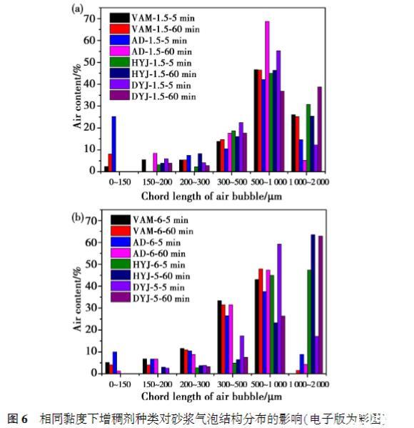 當溶液黏度為1.5mPa·s時,VAM和AD的摻入使砂漿初始含氣量相對于基準砂漿增大66%和71%,而HYJ和DYJ僅使初始含氣量提高26%和31%;當溶液黏度為6mPa·s時,VAM和AD的摻入使砂漿初始含氣量相對于基準砂漿增大46%和51%,而DYJ僅使初始含氣量提高6%,HYJ則降低含氣量26%.