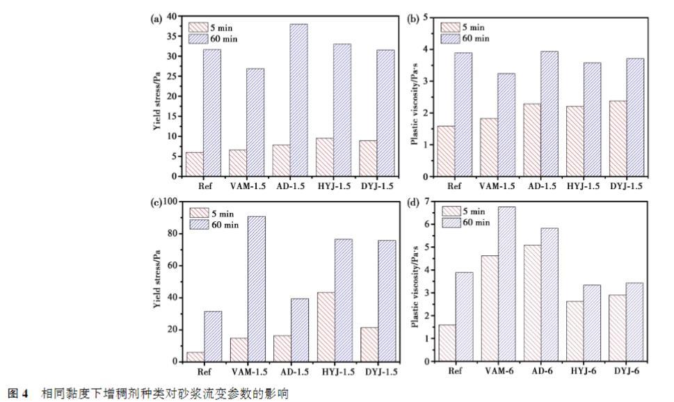 (1)增稠劑的加入顯著降低砂漿的流動度,提高砂漿的屈服應力和塑性黏度。