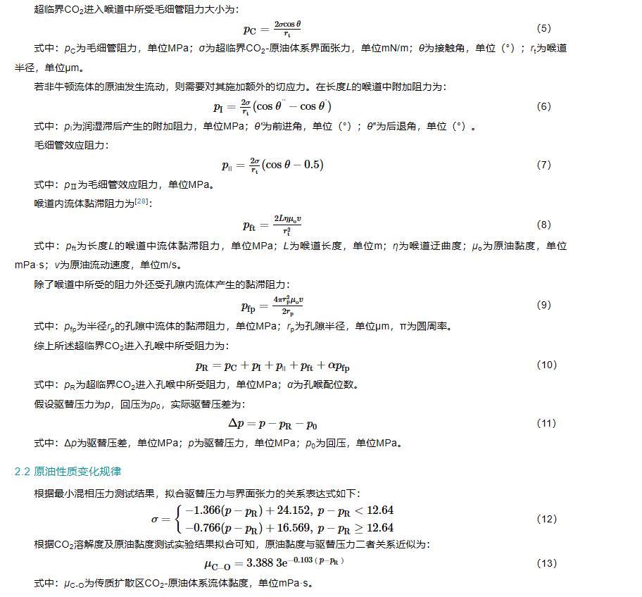 CO2進(jìn)入孔喉時與原油的接觸時間較短,來不及進(jìn)行擴(kuò)散、溶解,此時原油和CO2的物理性質(zhì)尚未發(fā)生變化。超臨界CO2進(jìn)入喉道中所受毛細(xì)管阻力是由超臨界CO2-原油界面張力、潤濕接觸角、孔喉半徑等參數(shù)共同引起: