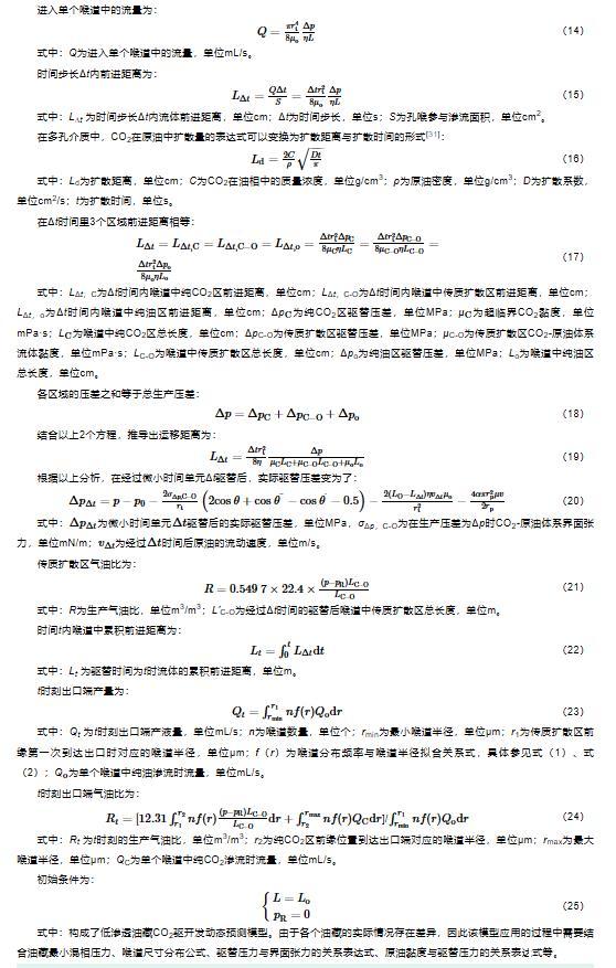 CO2驅(qū)能有效提高低滲透油藏采收率,但由于低滲透油藏普遍存在強(qiáng)非均質(zhì)性,導(dǎo)致CO2驅(qū)開發(fā)動態(tài)難以準(zhǔn)確預(yù)測。針對該問題,在綜合考慮喉道大小及分布、CO2溶解降黏和界面張力變化等因素的基礎(chǔ)上,結(jié)合CO2驅(qū)滲流力學(xué)理論,建立了基于時間節(jié)點(diǎn)的低滲透油藏CO2驅(qū)開發(fā)全過程動態(tài)預(yù)測模型。