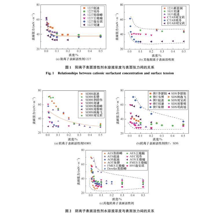 圖1陽離子表面活性劑水溶液濃度與表面張力間的關系