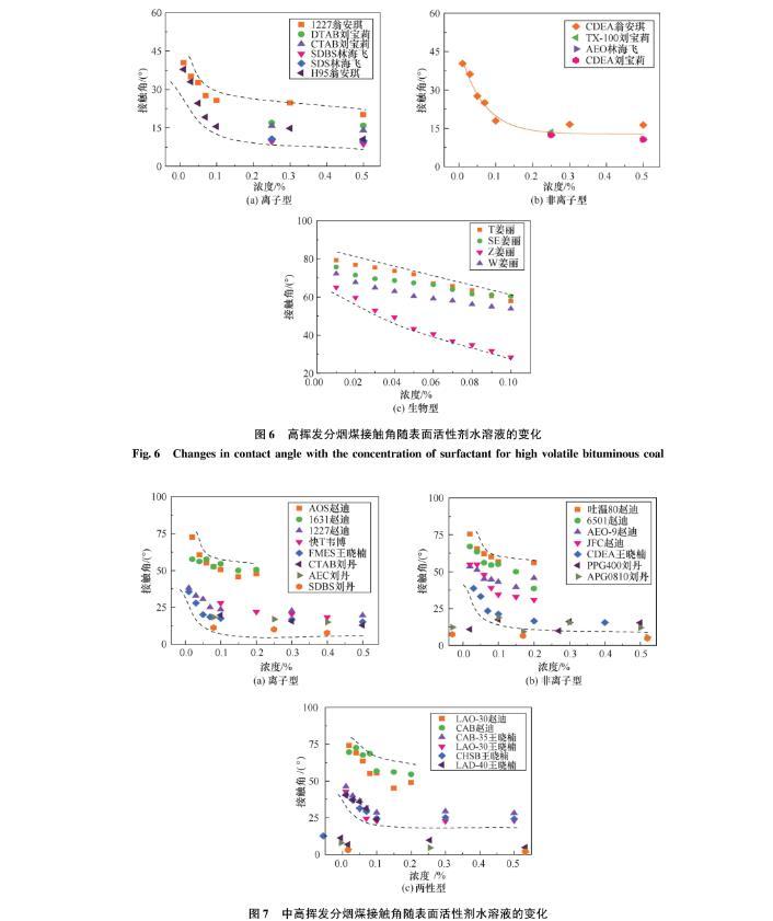 圖6高揮發分煙煤接觸角隨表面活性劑水溶液的變化
