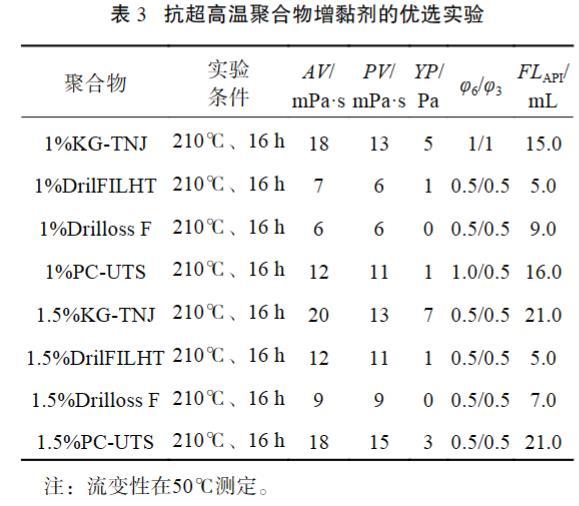室內(nèi)對(duì)4種高溫聚合物增黏劑材料進(jìn)行了單劑抗溫性能對(duì)比評(píng)價(jià)。其中KG-TNJ為溫敏疏水締和聚合物提黏劑,DrilFILHT為納米片狀氧化鎂酚醛樹脂改性聚合物增黏降濾失劑材料,Drilloss F為納米微球聚合物復(fù)合增黏聚合物材料,PC-UTS為某國外代表性高溫聚合物材料。評(píng)價(jià)配方:基礎(chǔ)配方+2.5%KG-UTSTA+聚合物,實(shí)驗(yàn)結(jié)果見表3。