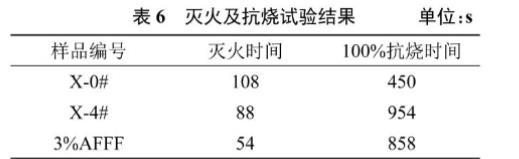 X-4#樣品泡沫具有高泡沫穩定性,在以下研究中,著重研究X-4#與X-0#、3%AFFF相比的滅火及抗燒性能,測得的滅火時間及100%抗燒時間見表6。根據GB 15308—2006規定,滅火時間小于180 s,抗燒時間高于600s的泡沫被認為具有成為消防泡沫滅火劑的潛力,X-4#樣品滅火時間88s、抗燒時間954 s,抗燒時間優于3%AFFF,滅火時間比3%AFFF略高,但滿足消防用泡沫滅火劑性能要求,具有良好的消防滅火應用潛力。