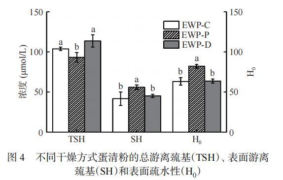 圖4不同干燥方式蛋清粉的總游離巰基(TSH)、表面游離巰基(SH)和表面疏水性(H0)