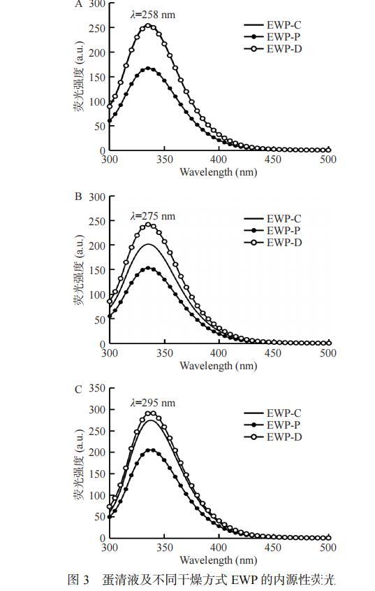 蛋白質的固有熒光來自于內部的芳香族氨基殘基(酪氨酸Tyr、色氨酸Trp、苯丙氨酸Phe),其熒光最大值(λmax)、強度對其微環境的極性極其敏感,因此可用來表征蛋白質的三級結構變化,其中Trp、Tyr和Phe的特有熒光激發波長分別為295、275和258 nm。如圖3所示,與EWP-C相比,不同干燥方式制備的蛋清粉的固有熒光強度降低但熒光峰的位置未有明顯的遷移。EWP-P的熒光強度低于EWP-D于EWP-C,可能是因為噴霧干燥的干燥溫度高,蛋清蛋白變性程度大,芳香族氨基酸殘基暴露于更極性環境中,進而發生了熒光猝滅現象。此外,EWP-P的熒光強度較低還可能是由于蛋清蛋白中含有葡萄糖,在高溫下會與蛋白質發生美拉德反應,屏蔽了芳香族氨基殘基。
