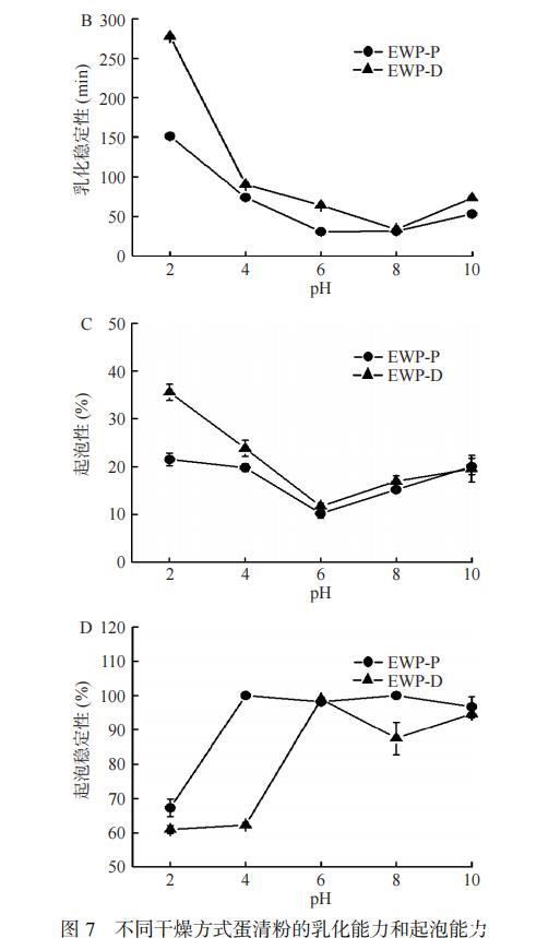 Dabbour等研究向日葵蛋白時也發現所有的蛋白樣品在pH6.0時的起泡性最低,且冷凍干燥樣品的起泡性優于對流烘箱干燥樣品。另一方面,泡沫穩定性與蛋白膜的強度有關,蛋白質在攪打時,蛋白質分子被吸附在空氣-水界面,蛋白質分子重新排列,使其疏水部分朝向氣相方向,這種變化容易引起巰基的氧化,在空氣-水界面與相鄰的蛋白質分子中的巰基形成二硫鍵,從而增強界面膜的強度,有利于泡沫穩定性。EWP-P的泡沫穩定性大于EWP-D,可能是因為噴霧干燥可能導致更多的蛋白質展開,表面游離巰基含量較多。另一方面可能是因為EWP-P發生了美拉德反應,在空氣-水界面上可以形成的厚的粘彈性美拉德產物層,有利于泡沫穩定性的增加。Zeng等研究不同干燥方式對雞皮膠原蛋白多肽時也發現噴霧干燥使其蛋白樣品的泡沫穩定性優于冷凍干燥樣品。