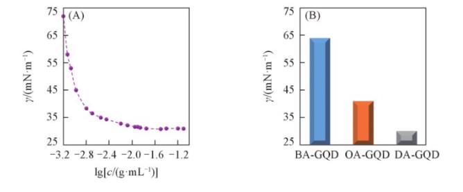 為了研究烷基鏈中碳原子數(shù)對表面活性的影響,按照1.2.1節(jié)方法,用丁胺和辛胺代替十二胺,分別制備了丁胺功能化石墨烯量子點(BA-GQD)和辛胺功能化石墨烯量子點(OA-GQD),并測定其最低表面張力。由圖3(B)可知,DA-GQD的表面張力比BA-GQD和OA-GQD的表面張力低得多,表現(xiàn)出更好的表面活性。3種石墨烯量子點的主要區(qū)別在于烷基胺的碳鏈長度,結(jié)果表明,烷基碳鏈長度對石墨烯量子點的表面活性有較大影響,烷基鏈越長,表面活性越好。上述規(guī)律與經(jīng)典的表面化學(xué)理論一致。