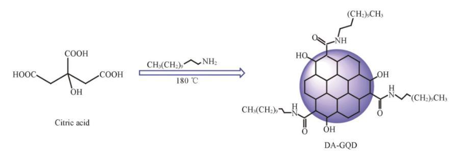 首先采用“自上而下”法,由CX-72炭黑在濃硝酸中回流24 h制備GQD。雖然能夠?qū)崿F(xiàn)一步同時制備單層和多層GQD,但是存在反應(yīng)時間長、強酸會對環(huán)境造成一定污染等弊端。本實驗設(shè)計通過“自下而上”法,以檸檬酸為前驅(qū)體、直鏈烷基胺為功能化試劑,通過一步熱裂解制備雙親性DA-GQD(見圖1)。檸檬酸分子之間脫水縮合形成六邊形sp2碳原子鍵合的石墨烯片,十二胺通過氨基與檸檬酸上的羧基縮合,將烷基鏈引入石墨烯片的邊緣以提高疏水性。