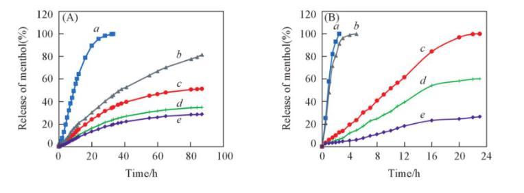 白家峰等采用聚多巴胺(PDA)修飾的介孔二氧化硅微球負載L-薄荷醇,發現PDA涂層有利于薄荷醇的可控緩慢釋放,在30℃空氣吹掃作用下,負載樣品中的薄荷醇在25 h后幾乎釋放完全;而在80℃空氣吹掃作用下,負載樣品中的薄荷醇在100 min后接近完全釋放。可見,本研究制得的負載體系具有較優的長效緩釋性能。