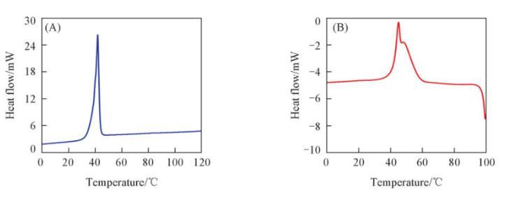 圖6(A)和(B)分別為空白樣品與負載型樣品的示差掃描量熱(DSC)曲線。從圖6(A)可以看出,L-薄荷醇樣品在大約42℃左右出現一個尖銳的吸熱峰,對應于L-薄荷醇的熔點。而負載型樣品則出現了兩個吸熱峰[圖6(B)],其中第一個峰主要是由生長在DA-GQD外表面的薄荷醇小晶體融化引起的,而第二個峰主要是由DA-GQD包覆的薄荷醇小晶體融化引起的。這與劉紹華等的研究結果相類似。