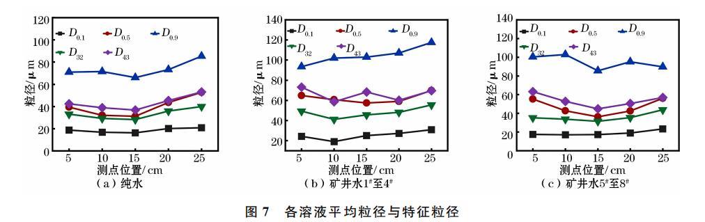 礦井水1#至8#在15cm處的平均粒徑和特征粒徑逐漸增大,這說明表面張力對噴霧平均粒徑和特征粒徑具有直接影響。礦井水1至4#各平均粒徑和特征粒徑之間差異明顯,而其余溶液差異較小,這表明純水和礦井水5#至8#的噴霧粒徑分布優(yōu)于礦井水1至4,霧場中霧滴更趨向均一化分布,易于捕集沉降粉塵。綜上,礦井水中Na+、K+離子濃度對其表面張力及噴霧液滴粒徑變化趨勢至關(guān)重要,對于霧場中噴霧粒徑的均一性和各平均粒徑和特征粒徑的差異性也有重要影響。