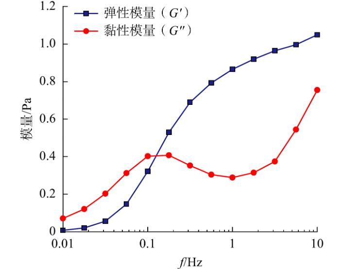 圖8為小段塞的黏彈性隨振動頻率(f)的變化情況。從圖8可看出,在低頻段,符合Maxwell流體模型。G"遠大于G',體系黏性占主導。隨著f的增大,G'迅速增長,增長到一定頻率時,G'變化曲線增長減緩。此時,G"隨著頻率的增大先增加后減小。當f繼續增大,體系處于高頻段,G''有所增加。可見,體系中存在膠束的破壞與重組,此時體系主要表現為彈性性能。在低頻區,形變發生較慢,膠束鏈能量較低;在高頻區,膠束鏈間沒有充足時間來發生滑動,膠束鏈交聯纏結點與固定網格節點近似相同,高的頻率使得這些網格結構的彈性逐漸增強。