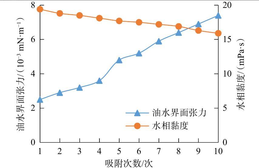 圖6吸附次數對ACS-2高黏表面活性劑體系的界面張力和水相黏度的影響
