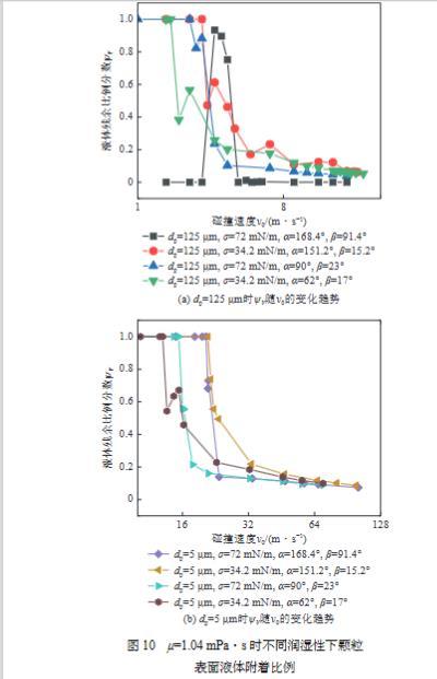 總結了霧滴—塵粒碰撞過程會發(fā)生的“反彈”、“完整聚并”、“包裹后撕裂”、“膜狀飛濺”4種行為類型,并發(fā)現碰撞后顆粒表面的液體附著比例變化曲線的轉折點與相應的碰撞行為密切相關。