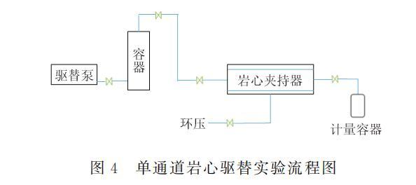 將3塊巖心抽真空后,飽和原油,根據(jù)飽和油的體積計算巖心孔隙度;將飽和好油的巖心在地層溫度下恒溫放置48h;使用標準鹽水進行水驅(qū)油,采出液含水率達到98%以上時停止,然后在地層溫度(30℃)下分別使用配制的CAO、CCAO和FHQ-I繼續(xù)以0.5PV的體積驅(qū)油,接著水驅(qū)直至含水率達到98%,計算出油體積,記錄驅(qū)替過程中壓力變化及采出液中的含油量,計算各階段采收率,結(jié)果見表6,驅(qū)替實驗流程如圖4所示。
