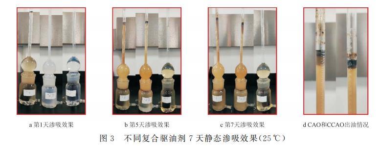 將巖心在110℃下烘干,稱重;將飽和好油的巖心置于阿莫特密封瓶(Amott cell瓶)中,分別加入試樣溶液(CAO、CCAO或FHQ-I的標準溶液)至略超過Amott cell瓶的最低刻度處,在25℃環(huán)境中,觀察并記錄其出油體積,通過計算得到的結(jié)果見表5,同時觀察不同時間飽和巖心滲吸出的原油形態(tài)(如圖3所示)。