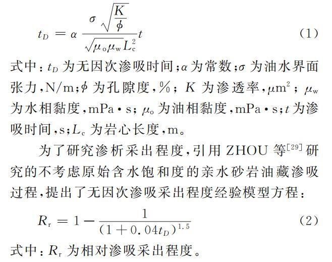 為研究黏度及界面張力對滲析采出程度的影響,引用MA等推導(dǎo)出的公式(1),式中同時考慮了親水系統(tǒng)和滲吸親油系統(tǒng)的無因次滲吸時間。