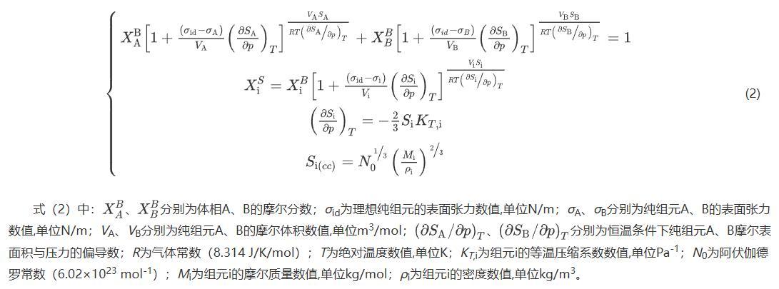 式(2)中:分別為體相A、B的摩爾分?jǐn)?shù);σid為理想純組元的表面張力數(shù)值,單位N/m;σA、σB分別為純組元A、B的表面張力數(shù)值,單位N/m;VA、VB分別為純組元A、B的摩爾體積數(shù)值,單位m3/mol;