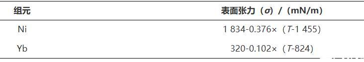 綜合LiF-CaF2-Yb2O3體系和Ni-Yb合金表面張力變化規律,表明隨電解溫度的升高,LiF-CaF2-Yb2O3熔鹽體系的表面張力減小,但僅在220~260 mN/m較小范圍內變化。Yb2O3在LiF-CaF2-Yb2O3體系中的含量引起的張力變化范圍同樣不顯著,在1 173~1 523 K溫度區間表面張力波動范圍小于20 mN/m。因此,Ni-Yb合金的表面張力值隨組分和溫度的變化決定合金與LiF-CaF2-Yb2O3體系的分離。