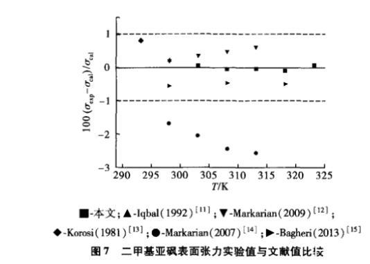 圖7 二甲基亞砜表面張力實驗值擬合得到的方程與文獻實驗值的偏差