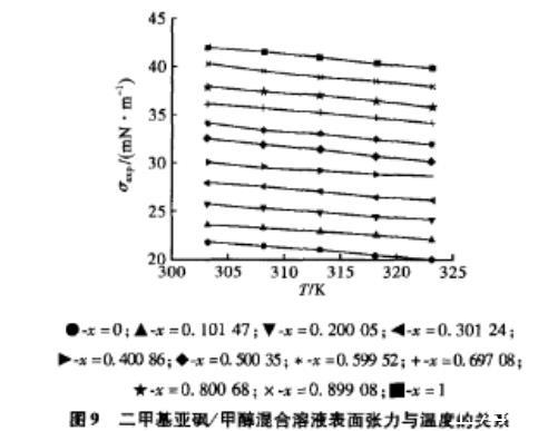 圖9 二甲基亞砜/甲醇混合溶液表面張力與溫度的關(guān)系
