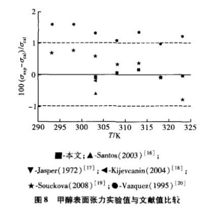 圖8為甲醇表面張力實驗值擬合得到的方程與文獻實驗值的偏差,本文數(shù)據(jù)與Santos等[15],Jasper[16],Kijevcanin等[17]和Souckova等[18]數(shù)據(jù)吻合得較好,與Vazquez等[19]數(shù)據(jù)偏差稍大,最大偏差為1.6%。