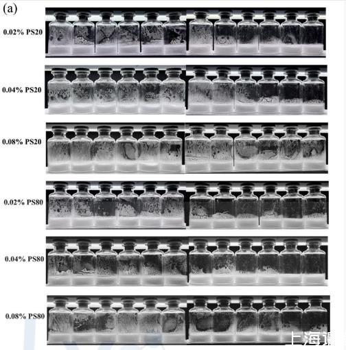 相應地,使用PS20或更高濃度表面活性劑的處方,凍干后霧化也更嚴重。在相同濃度下,用PS20制備的樣品比用PS80制備的樣品霧化現(xiàn)象更嚴重。