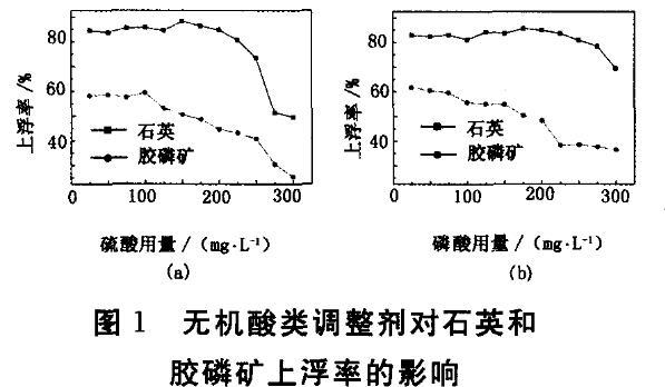硫酸和磷酸是較為有效的膠磷礦抑制劑,工業(yè)應(yīng)用廣泛。考察傳統(tǒng)調(diào)整劑對石英和膠磷礦可浮性的影響,結(jié)果見圖1。