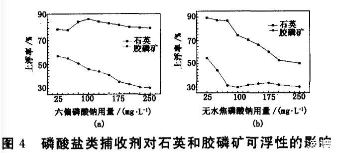 除了上述調(diào)整劑,含有磷酸根的六偏磷酸鈉及無水焦磷酸鈉也可抑制膠磷礦,這類磷酸鹽除了可以在酸性條件下抑制膠磷礦外,還能在礦漿中起到一定的分散作用。試驗結(jié)果見圖4。