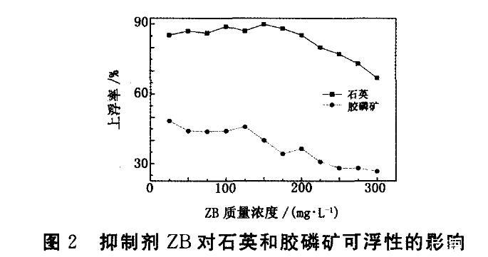 從圖2看出,ZB對膠磷礦和石英的抑制效果明顯,當(dāng)ZB用量為150 mg/L時,兩者上浮率差異達(dá)到最佳,為54.90個百分點。與圖1對比可知,使用ZB做調(diào)整劑時,可在用量較低時得到更好的抑制效果。并對添加ZB后的礦漿pH值進行測定,當(dāng)ZB用量達(dá)到150 mg/L時,礦漿pH為1.2左右;當(dāng)ZB用量超過200 mg/L時,石英上浮率仍保持在70%以上,說明使用ZB不會造成石英上浮率明顯下降,更有利于膠磷礦和石英的有效分離。