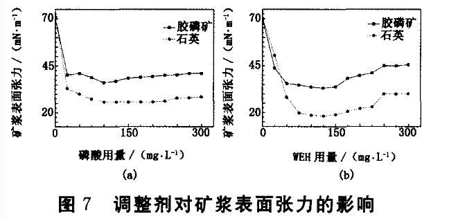 本研究對多種調整劑作用下石英和膠磷礦的可浮性進行了考察,并通過表面張力分析說明礦漿表面張力的影響及捕收劑AY在礦漿中的活性,但還需要在以后的研究工作中進一步探討捕收劑在石英和膠磷礦表面的吸附機理。