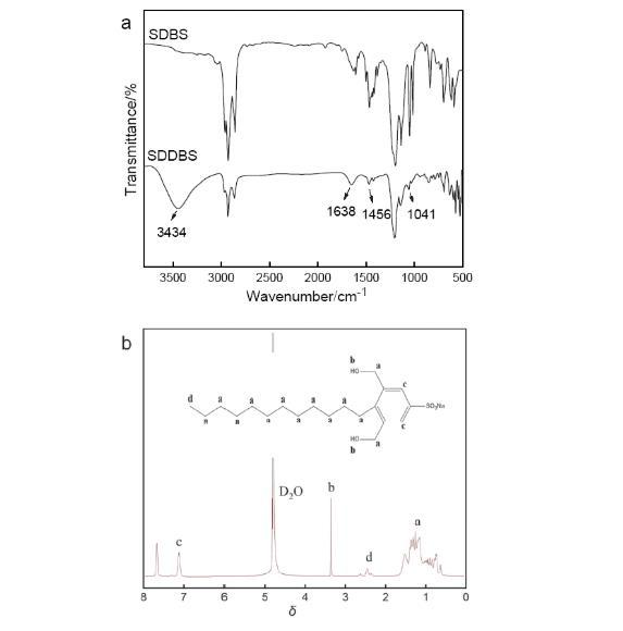 界面潤濕性調控驅油劑SDDBS的合成示意圖如圖1所示.通過紅外光譜和核磁共振氫譜對合成原料十二烷基苯磺酸鈉(SDBS)和最終產物二羥甲基十二烷基苯磺酸鈉(SDDBS)進行結構表征.由圖2a可見,位于1456和1638 cm-1的特征峰證明了苯環的存在,3434 cm-1處寬峰為O―H的伸縮振動峰,通過對比SDBS和SDDBS的紅外光譜,可以判斷SDDBS中含有羥基基團.由圖2b可得,δ4.8為D2O溶劑峰;δ0.6~1.49為亞甲基上的質子峰(a);δ2.32~2.60的三重峰為甲基上的質子峰(d);δ3.35為羥基上的質子峰(b);δ7.14為芳烴特征峰(c).通過1H NMR確定了最終產物中羥基等基團的存在及位置.紅外光譜和核磁共振氫譜結果表明目標產物SDDBS合成成功,結構準確.