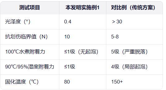 失效分析:對(duì)比例2(高羥樹(shù)脂<5份)因交聯(lián)密度不足,抗劃傷性能僅5N;對(duì)比例5(純高羥樹(shù)脂)因未反應(yīng)羥基殘留,水煮后附著力驟降。本發(fā)明通過(guò)樹(shù)脂配比精準(zhǔn)控制,兼顧啞光需求與力學(xué)性能。