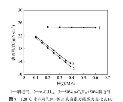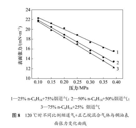 圖7對比了120℃時(shí)煙道氣、正己烷和煙道氣+正己烷3種氣體與稠油的表面張力變化規(guī)律。由圖7可見:當(dāng)溫度一定時(shí),3種氣體-稠油表面張力均隨壓力的增大而減小,但是變化的幅度不同;在低壓下,煙道氣對降低稠油表面張力作用有限,當(dāng)氣體中含有正己烷時(shí),稠油的表面張力明顯降低;在120℃和0.3 MPa時(shí),煙道氣-稠油表面張力為24.70mN/m,向煙道氣中加入50%(摩爾分?jǐn)?shù))的正己烷后表面張力為15.89mN/m,與純正己烷氣體表面張力相差不大,后者為 15.19 mN/m。前面的研究表明,煙道氣-稠油表面張力可以由 CO2-稠油表面張力和 N2-稠油表面張力線性疊加得到,但是對于煙道氣+正己烷混合氣體,正己烷對降低表面張力起主要作用,不能簡單的由煙道氣-稠油表面張力和正己烷-稠油表面張力進(jìn)行簡單的線性插值進(jìn)行計(jì)算。
