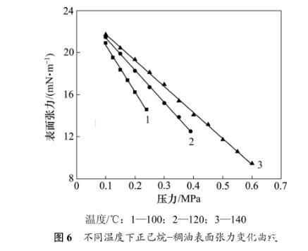 2)當(dāng)壓力一定時(shí),溫度升高,煙道氣-稠油表面張力降低,正己烷-稠油表面張力則升高。在接近飽和蒸氣壓時(shí),正己烷-稠油表面張力隨溫度的升高而越小。