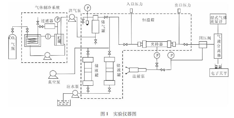實(shí)驗(yàn)所用裝置為地質(zhì)封存條件下CO2遷移物模擬平臺(tái),如圖1所示。主要結(jié)構(gòu)分為以下幾個(gè)系統(tǒng):氣體制冷系統(tǒng)、氣體注入驅(qū)替系統(tǒng)、液入驅(qū)替系統(tǒng)、回環(huán)壓系統(tǒng)、巖心夾持系統(tǒng)、量系統(tǒng)、抽真空系統(tǒng)及數(shù)據(jù)采集和微機(jī)測(cè)控系統(tǒng)等。CO2氣體經(jīng)氣體制冷系統(tǒng)冷卻后通過(guò)注氣壓注入儲(chǔ)氣罐,最大注入壓力20MPa。液體現(xiàn),通過(guò)注水泵恒流注入儲(chǔ)液罐,最大注入流量為9.9ml/min。通過(guò)注射泵設(shè)置回、環(huán)壓。儲(chǔ)氣罐和儲(chǔ)液罐通過(guò)出氣、出液閥門將CO2、液體括注入巖心夾持器。通過(guò)真空泵對(duì)巖心抽真空。口端的氣體、液體通過(guò)氣液分離器分離,氣體通過(guò)濕式氣體流量計(jì)記錄瞬時(shí)和累計(jì)流量,體通過(guò)電子天平稱重的方式記錄其瞬時(shí)和累g計(jì)流量。瞬時(shí)的入口、出口壓力通過(guò)計(jì)算機(jī)記秦玉錄。儲(chǔ)氣罐、儲(chǔ)液罐、巖心夾持器都放置于恒溫況箱內(nèi),通過(guò)恒溫箱控制其內(nèi)部溫度,范圍為室溫至120℃。