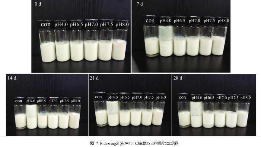 制備了不同pH下PPP-NP穩(wěn)定的水包油Pickering乳液,并在45℃下加速儲存28 d,每7 d進(jìn)行拍照記錄其視覺外觀的變化。乳液的視覺外觀監(jiān)測照片如圖7所示。con和pH4.0的乳液在加速儲藏7 d后發(fā)生分層和聚結(jié)等現(xiàn)象;pH6.5的乳液在第14 d時(shí)底部出現(xiàn)分層現(xiàn)象;pH7.0~8.0的乳液在儲藏28 d后仍保持良好的視覺外觀,未出現(xiàn)相分離、聚結(jié)等現(xiàn)象,在整個實(shí)驗(yàn)過程中均保持均勻穩(wěn)定。這些現(xiàn)象直觀地表明PPP-NP具有良好的乳化能力,且制備出的乳液具有較好的穩(wěn)定性,這可能與蛋白聚集體表面疏水性提高,從而有效降低其在油水界面上吸附所需的能量。