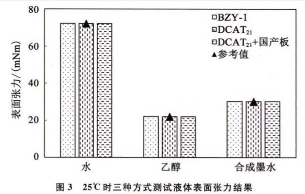 使用BZY-1表面張力儀(原配國(guó)產(chǎn)鉑金板)、表面張力儀(原配進(jìn)口鉑金板)和表面張力儀(選配國(guó)產(chǎn)鉑金板)對(duì)水、無水乙醇、合成墨水進(jìn)行表面張力測(cè)試,測(cè)試結(jié)果如圖3所示。