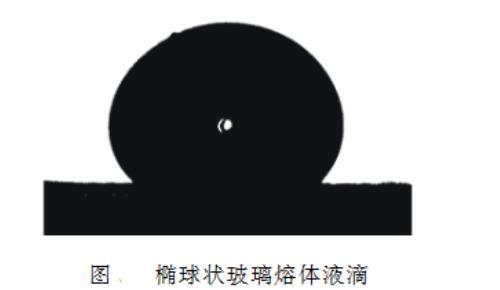 將制備的玻璃樣塊用錫紙包裹,用鐵錘捶碎后用鉗子修整成較方正的顆粒,選取內部無氣泡結石且質量為 0.15~0.30 g 的碎塊用于測試。測試前選用 T? 溫度表面張力為 334 mN/m 的標準鈉鈣玻璃校準表面張力測量儀。測試的具體操作步驟如下:將表面張力測量儀加熱爐升溫至測量溫度,通入高純氮氣作為保護氣體,然后將制備好的玻璃樣品置于石墨片上,送入加熱爐中的樣品臺上進行保溫,試樣在表面張力作用下收縮成橢球狀液滴,如圖 2 所示,將液滴置于拍攝裝置視野中心,保溫 30 min 至熔體穩定。隨后,用圖像采集裝置獲取橢球熔體的外輪廓線,通過軟件數值分析得到輪廓參數,利用 Young-Laplace 方程進行解析,計算出樣品的表面張力(σ),反復測試若干次后取 σ 的平均值為樣品在該測試條件下的表面張力值。