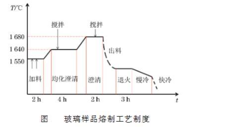 實驗樣品的熔制流程如圖 2 所示,首先根據組分設計計算玻璃配方,稱量并配制約 500 g 配合料,在研缽內充分研磨、混合均勻,待硅鉬棒電爐升溫至 1550 ℃ 時,將混合均勻的配合料分多次加入預熱過的鉑金坩堝中,保溫 2 h 至原料熔化充分后以 5 ℃/min 的升溫速率加熱至 1640 ℃,并在該溫度條件下保溫 4 h,實現玻璃的充分熔化與澄清。然后繼續升溫至 1680 ℃ 保溫 2 h 使玻璃液完全澄清,出料前 30 min 進行攪拌,然后將玻璃液澆筑在預熱的耐熱鋼模內,成型后轉入 780 ℃ 的馬弗爐內進行退火處理,保溫 3 h 后再以 1 ℃/min 降溫速率慢冷至 300 ℃,隨爐冷卻得到經過退火的玻璃樣塊。