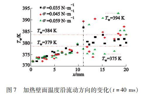 圖7加熱壁面溫度沿流動方向的變化(t=40 ms)