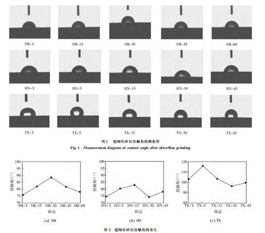 3種煤樣超細粉碎后的接觸角變化見圖1、2。可以看出,變質(zhì)程度高的太西煤的接觸角在100°左右波動,明顯大于神木不粘煤和淮南氣煤的接觸角(在75°左右變化)。還可以看出,濕法超細粉碎后3種變質(zhì)程度煤樣的接觸角的變化規(guī)律相似,在短時間的濕法超細粉碎后,接觸角變大,疏水性增強,隨著超細粉碎時間的延長,接觸角減小??傮w來看,神木煤與淮南煤在濕法超細粉碎后的接觸角大于超細粉碎前的,說明對于低階煤,在濕法超細粉碎后,煤顆粒表面的疏水性在一定程度上有所增強,潤濕性減弱;太西煤在濕法粉磨30、45min后的接觸角小于超細粉碎前的,由此可得,對于高階煤,長時間進行濕法超細磨礦會劣化煤顆粒表面的疏水性。