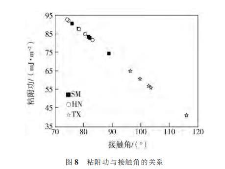 將接觸角θ與γlg代入式(9)可得煤顆粒與水的粘附功,結(jié)果見圖7。由圖可知,隨著超細粉碎時間的延長,煤-水體系的粘附功的變化趨勢與接觸角的變化趨勢相反。3種煤樣的接觸角與粘附功的關(guān)系見圖8。由圖可知,隨著接觸角的增大,煤-水界面的粘附功減小,說明粘附功越小,煤顆粒的潤濕性越差。粘附功也可作為衡量煤顆粒潤濕性的指標。