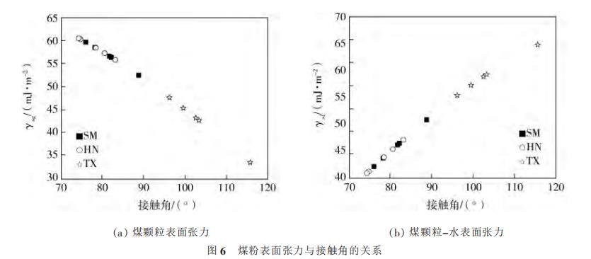 2)隨著變質(zhì)程度的增加,煤顆粒的表面張力減小;隨著煤顆粒粒度的減小,不同變質(zhì)程度煤樣的表面張力與接觸角呈負相關(guān),煤-水界面張力與接觸角呈正相關(guān);接觸角增大,煤顆粒表面張力減小,煤-水界面張力增大。