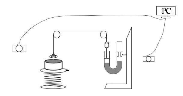圖4為該實(shí)驗(yàn)裝置設(shè)計(jì)圖。該定量實(shí)驗(yàn)材料有U型管、砝碼(與金屬吊環(huán)一樣重)、活塞(與U型管內(nèi)徑相吻合且質(zhì)量極小)、定滑輪、升降臺和水槽、兩個數(shù)碼相機(jī)。其中一個相機(jī)用于錄像U型管示數(shù)變化,另一個相機(jī)用于觀察吊環(huán)形成水膜的狀態(tài)。最終兩個相機(jī)的圖像傳輸至PC端便可準(zhǔn)確讀出水膜在對應(yīng)狀態(tài)下U型管液面高度的示數(shù)。