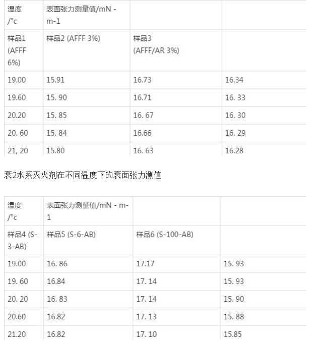溫度條件對于液體表面張力存在著很大的影響。大 量試驗(yàn)數(shù)據(jù)表明,液體的表面張力會隨著溫度的升高而 降低。通過對一系列流體滅火劑產(chǎn)品,包括不同配比的 泡沫滅火劑(成膜型)、水系滅火劑等樣品進(jìn)行測試,可以 清晰地從表1、表2中看出,溫度的變化對流體型滅火剤 的表面張力存在一定程度的影響。